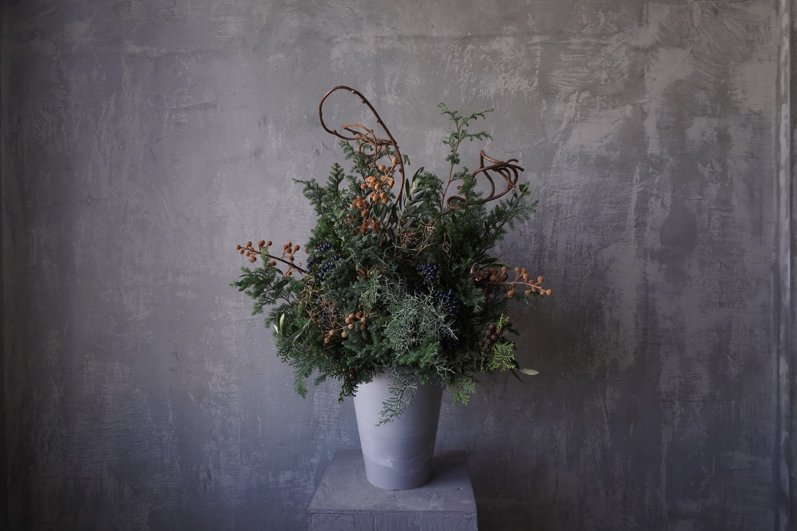 さまざまな針葉樹を集め、冬の森のようにアレンジしました