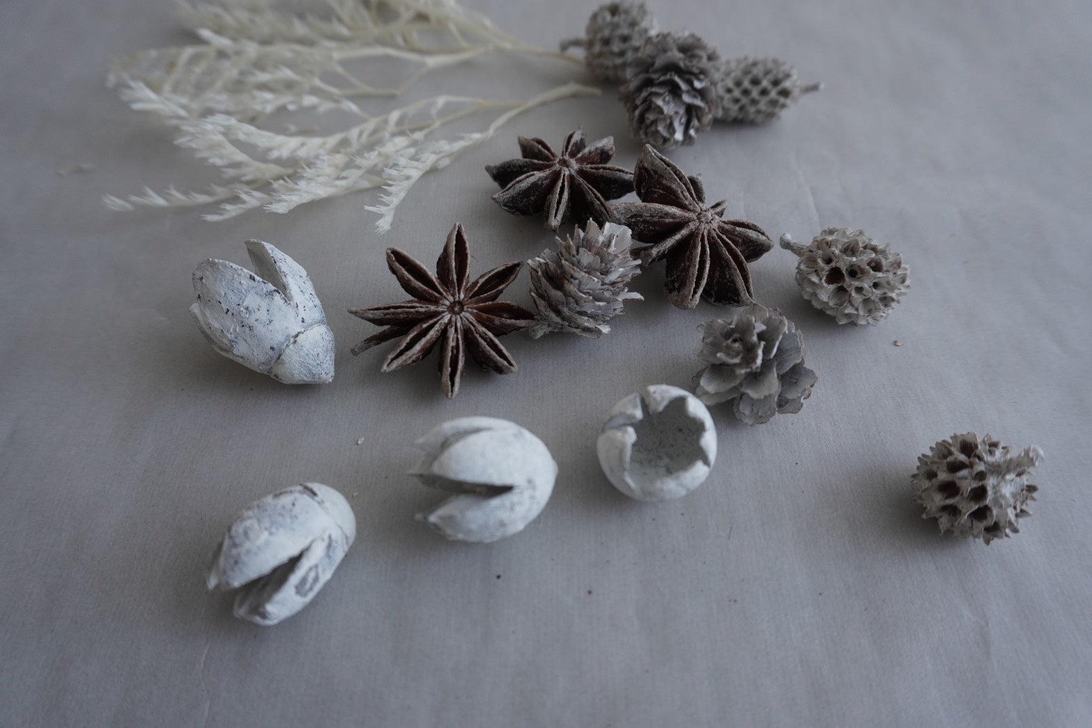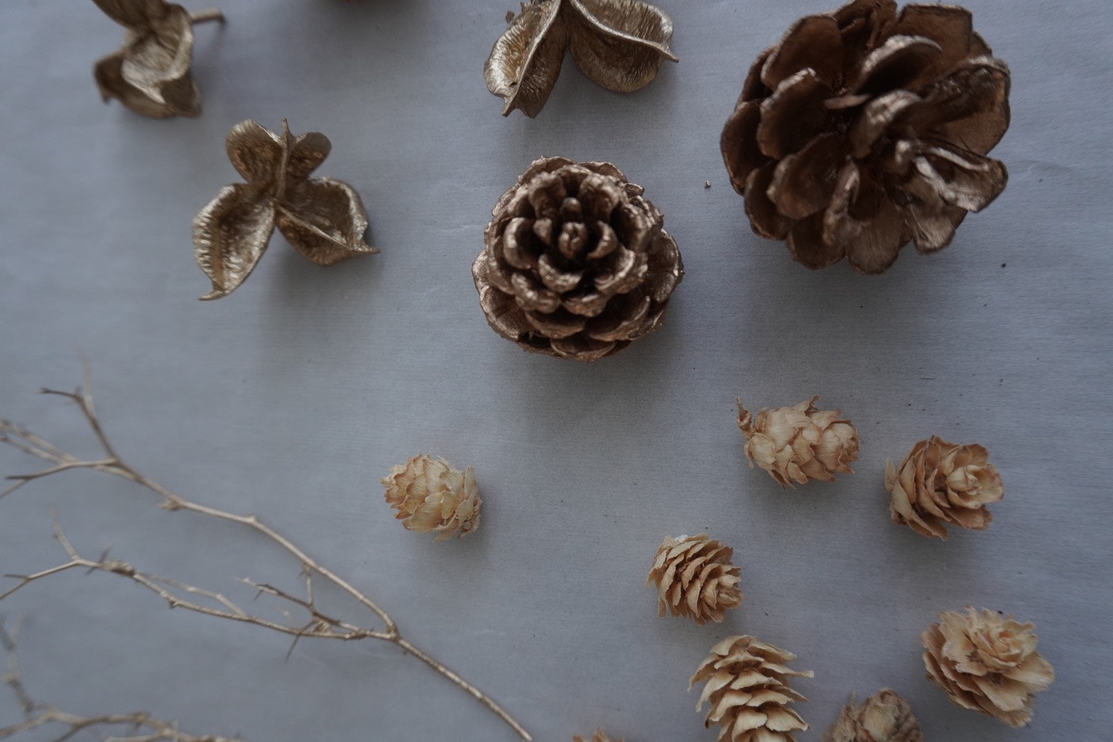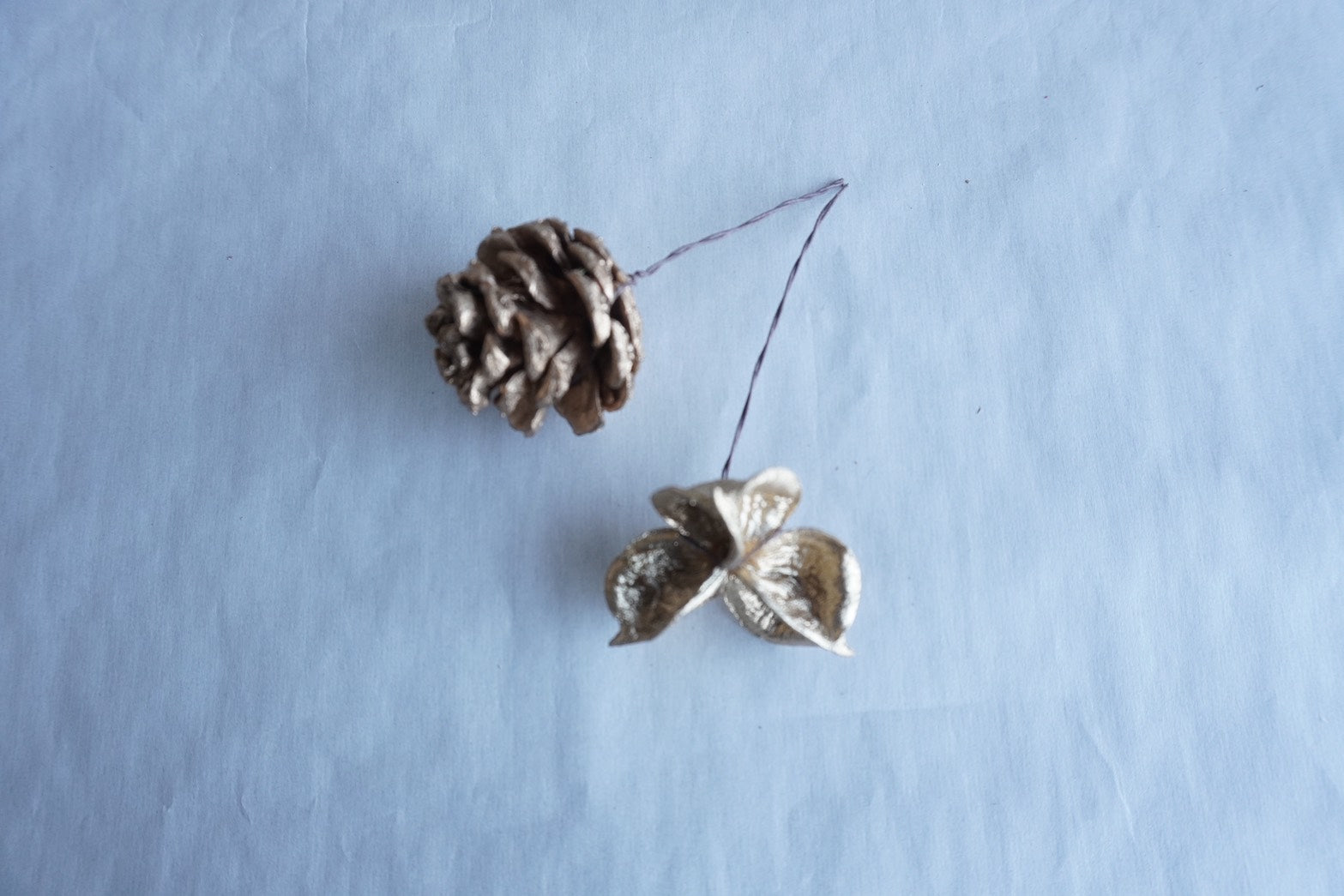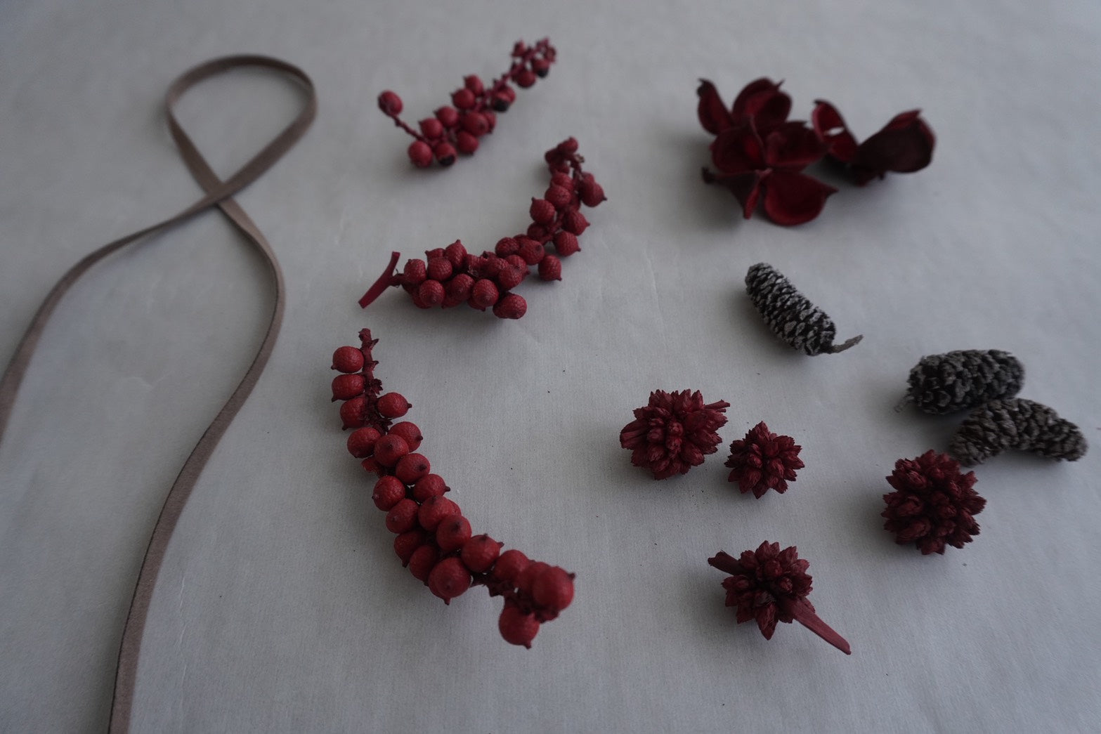 キットの内容は、ツリー型にアレンジした針葉樹、ワイヤーがついたオーナメント